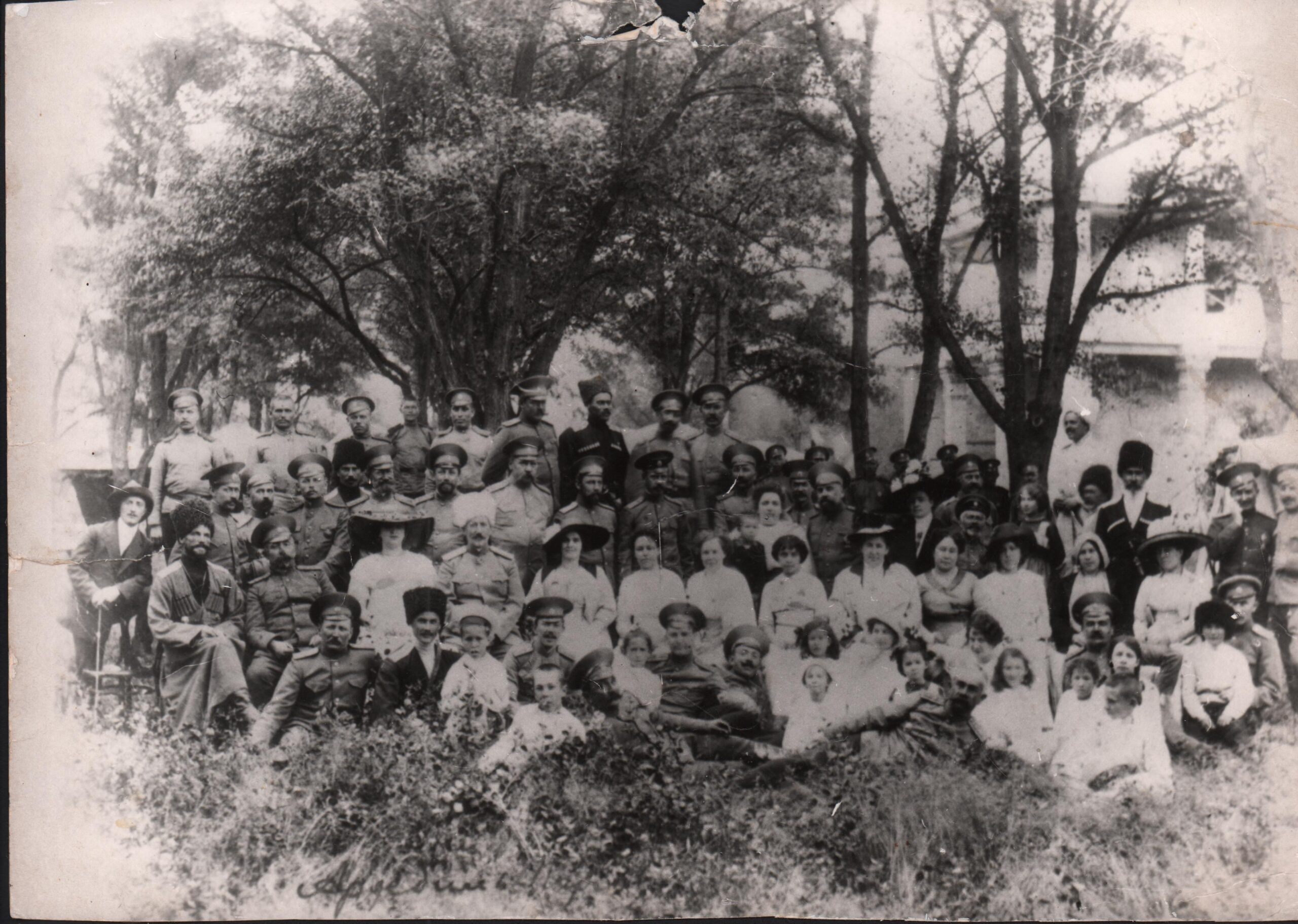 Сидят (слева направо): третья — Великая княгиня, супруга императора Николая II; рядом, в белой папахе, — генерал Сафарбек Мальсагов. Стоит в первом ряду (слева направо): восьмой, в центре, — император Николай II.