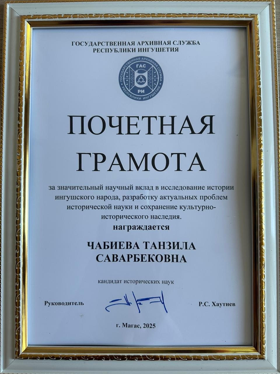 За значительный научный вклад в исследование истории ингушского народа, разработку актуальных проблем исторической науки и сохранение культурно-исторического наследия кандидат исторических наук Чабиева Танзила Саварбековна награждена Почётной грамотой Государственной архивной службы Республики Ингушетия.