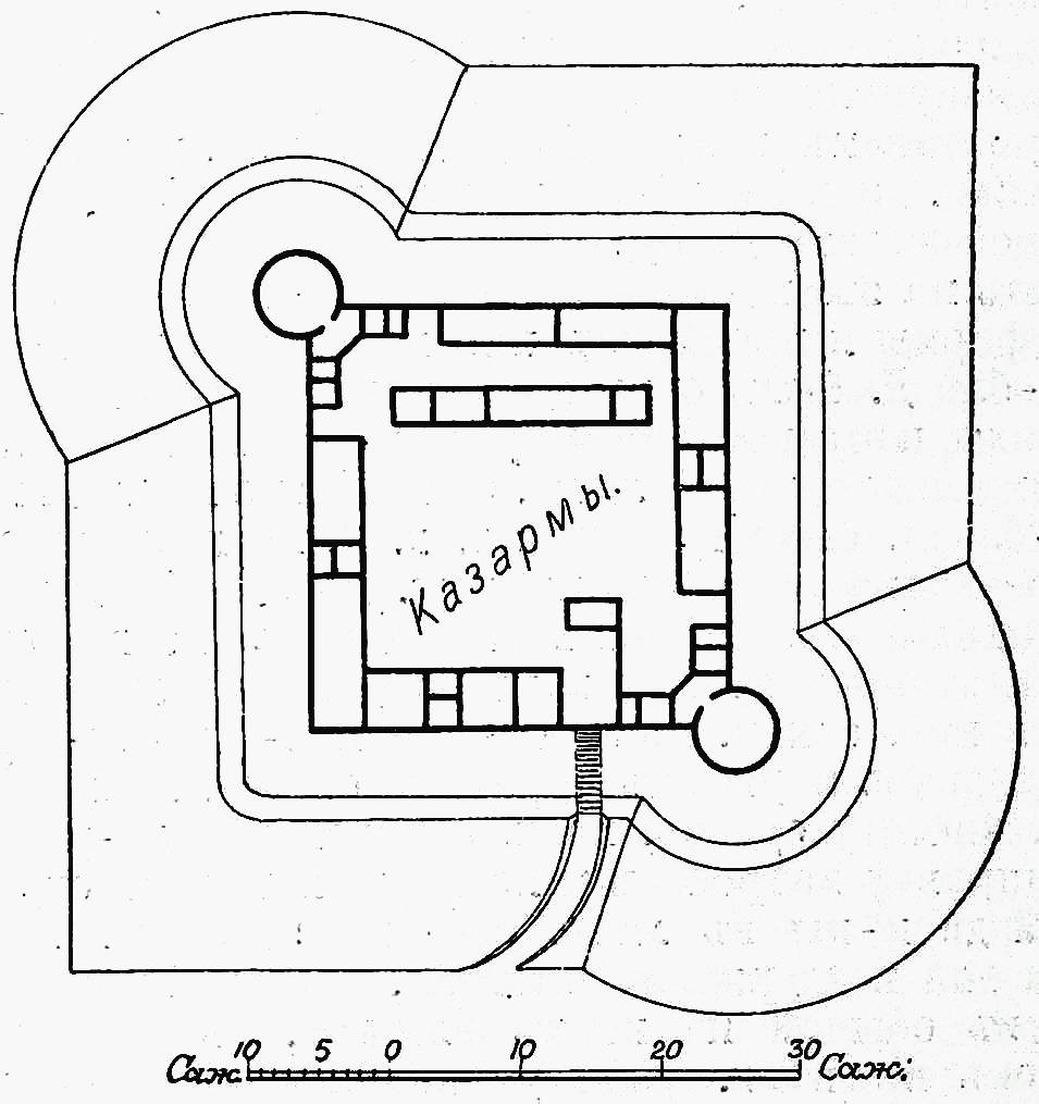 Крепость была построена в форме квадрата с двумя башнями в противоположных углах (юго-восточном и северо-западном). Внутри укрепления находились казармы, а снаружи оно было окружено рвом и гласисом.