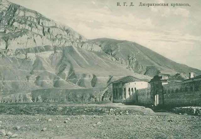 «ДЖЕРАХОВСКОЕ УКРѢПЛЕНІЕ — отдѣльное и самостоятельное, возведенное во Владикавказ. округѣ въ 1846 г. и тогда же занятое гарнизономъ. Имѣло видъ правил. квадрата съ 2 кругл. выступами въ 2 цротиволежащихъ углахъ. Внутри укр-нія находились казармы, а снаружи оно б. окружено рвомъ и гласисомъ.» Военная энциклопедія (Сытинъ, 1911—1915).