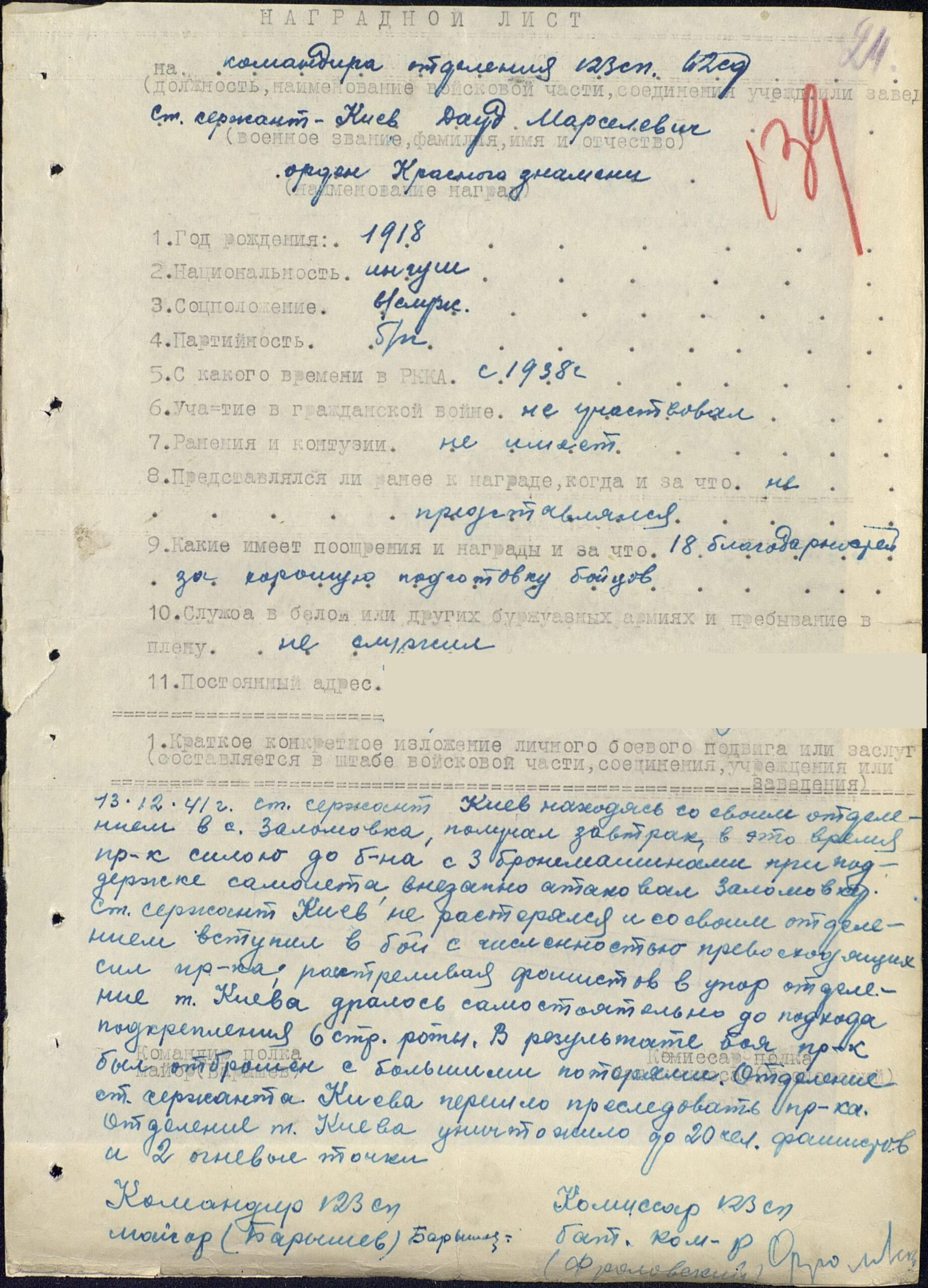 КИЕВ Дауд Марселевич. 1918 г.р. Ингуш. Старший сержант. Командир отделения 123 СП 62 СД. В Красной Армии с 1938 г. Представляется к правительственной награде орден КРАСНОГО ЗНАМЕНИ.