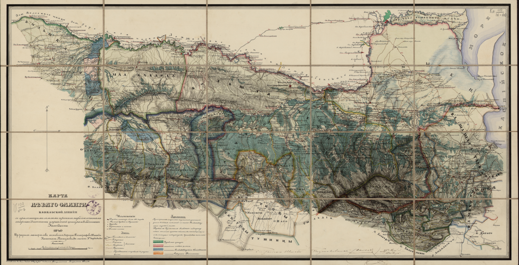 Карта левого фланга Кавказской линии 1840 года с «прилежащими землями горских народов и частями северного Дагестана, управлений центра и Владикавказ».