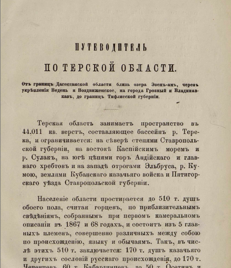 Предлагаем вниманию посетителей очередную уникальную и крайне интересную книгу – «Путеводитель по Терской области», изданный в 1871 году типографией Главного управления наместника Кавказского.