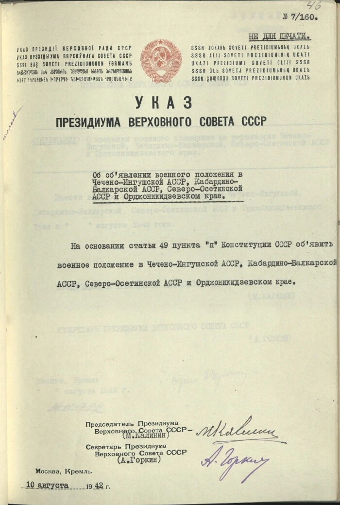 Указ Президиума Верховного Совета СССР № 7/160 «Об объявлении военного положения в Чечено-Ингушской АССР, Кабардино-Балкарской АССР, Северо-Осетинской АССР и Орджоникидзевском крае», с приложением проекта указа, поступивший из Оперативного управления Генерального штаба Красной армии. Источник: ГА РФ. Ф. Р-7523. Оп. 4. Д. 76. Л. 46, 47-48