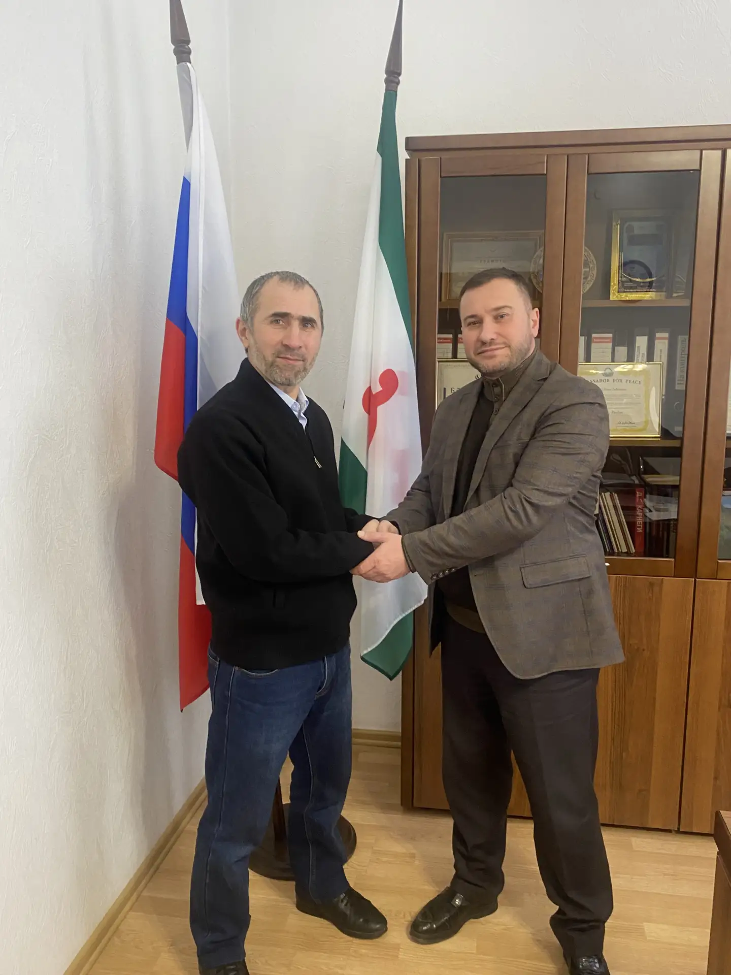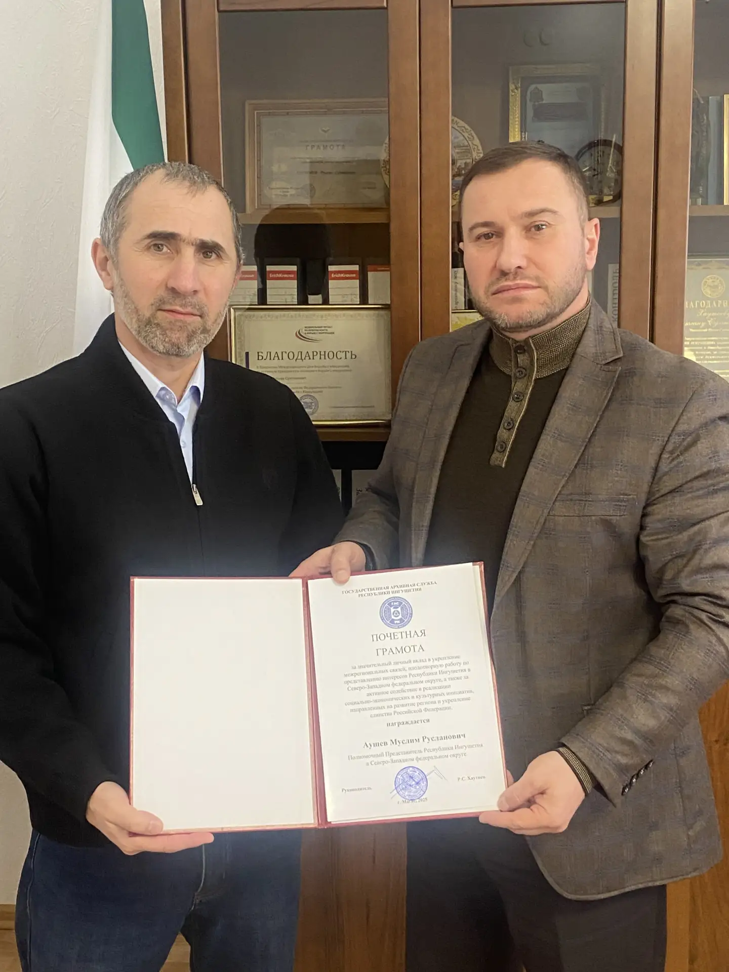 Сегодня в Государственной архивной службе Республики Ингушетия состоялась рабочая встреча руководителя ведомства Руслана Хаутиева с Полномочным представителем Республики Ингушетия в Северо-Западном федеральном округе Муслимом Аушевым. В ходе встречи были рассмотрены вопросы организации и проведения запланированных мероприятий в Санкт-Петербурге, направленных на выявление, документальное подтверждение и увековечение памяти уроженцев Республики Ингушетия — участников Ленинградской битвы.