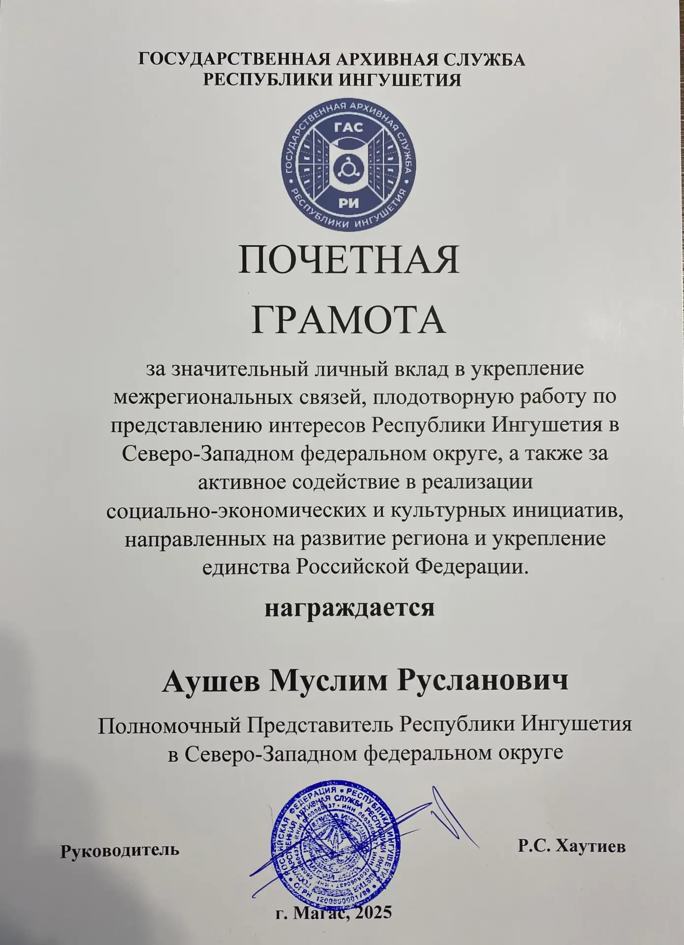 В завершение встречи Руслан Хаутиев выразил благодарность Полномочному представителю М.Аушеву, а также заместителю руководителя Государственного автономного учреждения «Представительство Республики Ингушетия в Санкт-Петербурге и Ленинградской области» М.Ж. Цороевой за конструктивное сотрудничество, высокий профессионализм и весомый вклад в развитие межрегиональных связей, эффективную координацию взаимодействия между Республикой Ингушетия и Санкт‑Петербургом, Ленинградской областью, а также за активную работу по продвижению культурных инициатив, способствующих укреплению единства Российской Федерации.