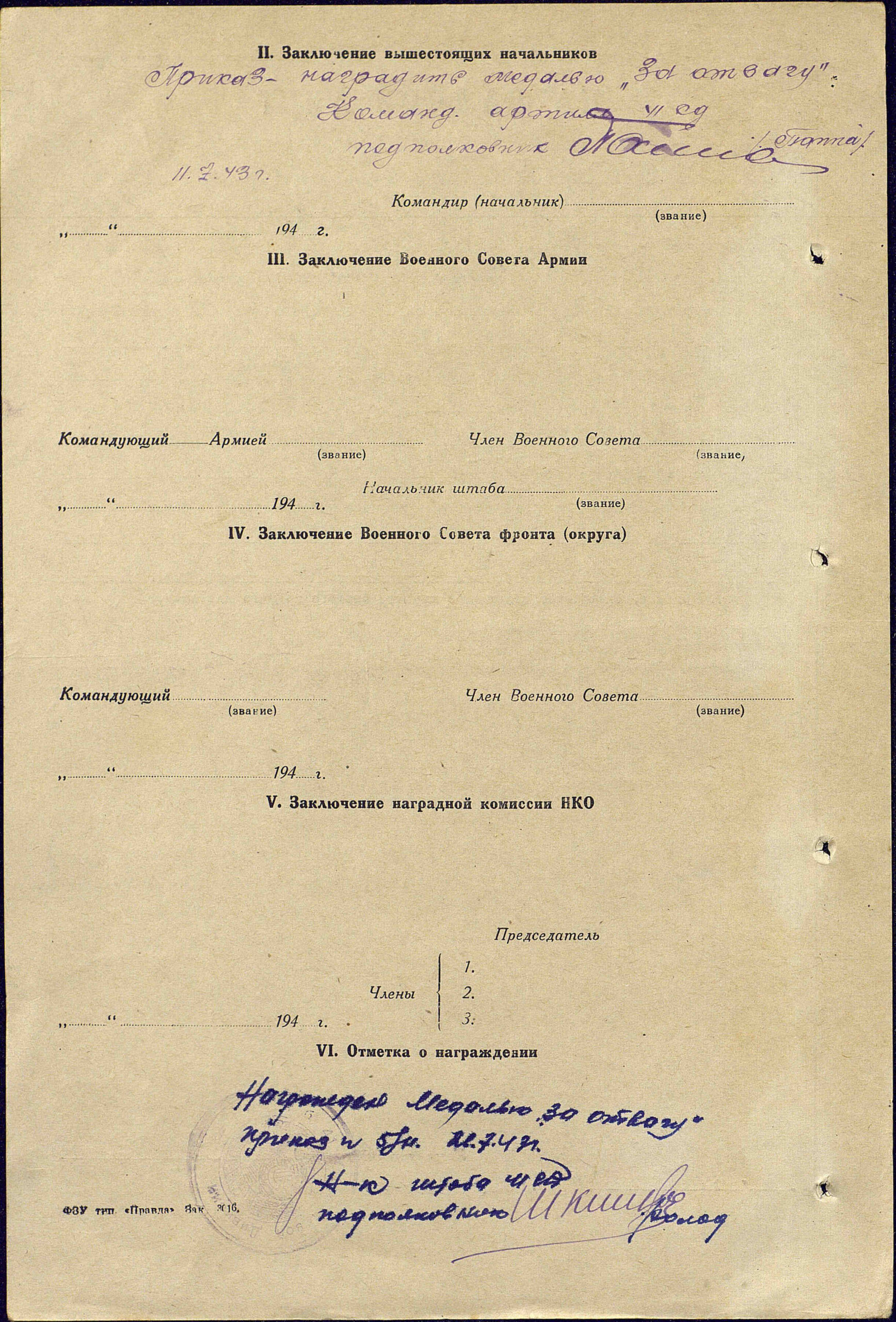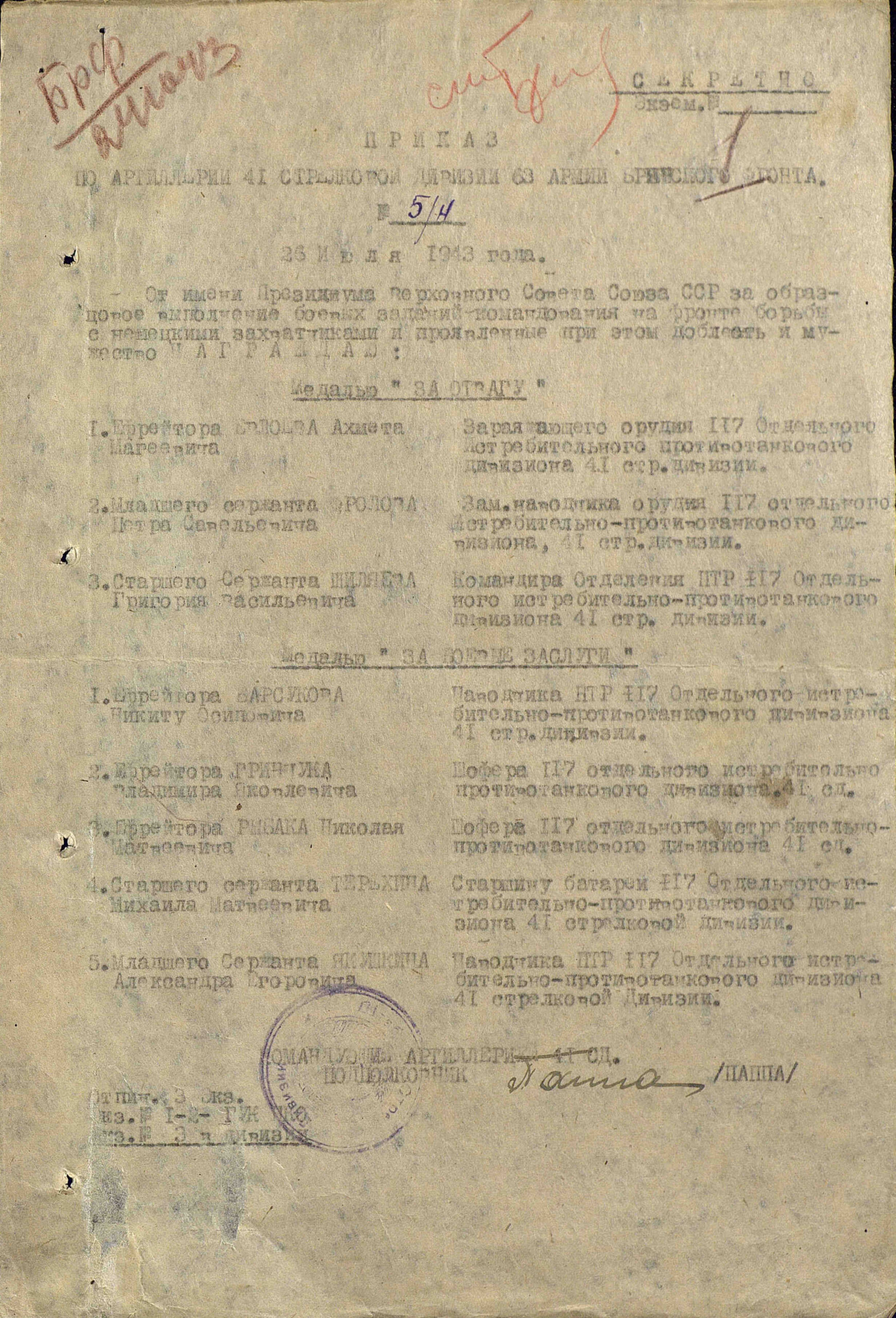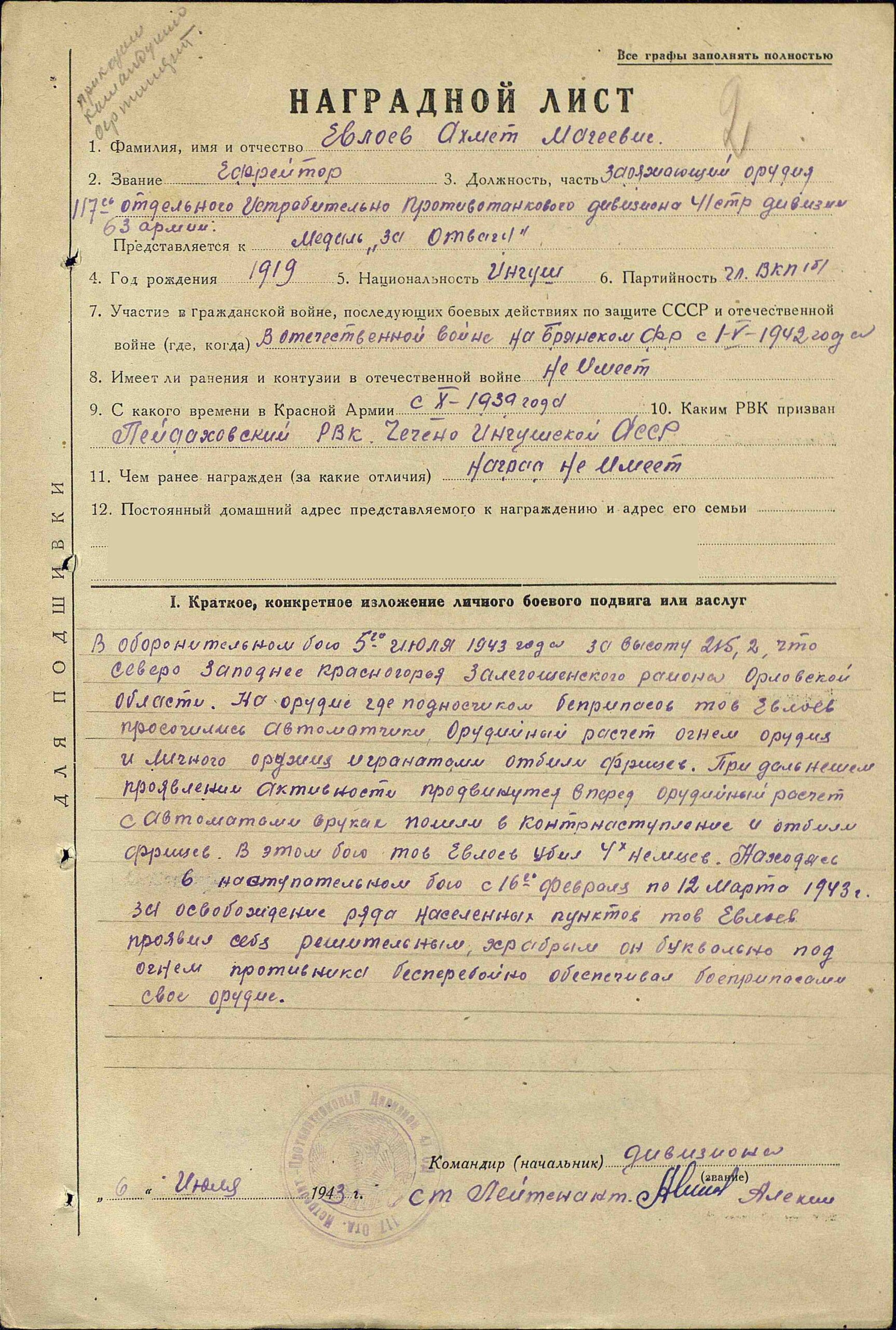 Наградной лист ефрейтора Евлоева Ахмета Магеевича заряжающего орудия 117 отдельного истребительного противотанкового дивизиона 41 стр. дивизии 63-й Армии, воевал на Брянском направлении.