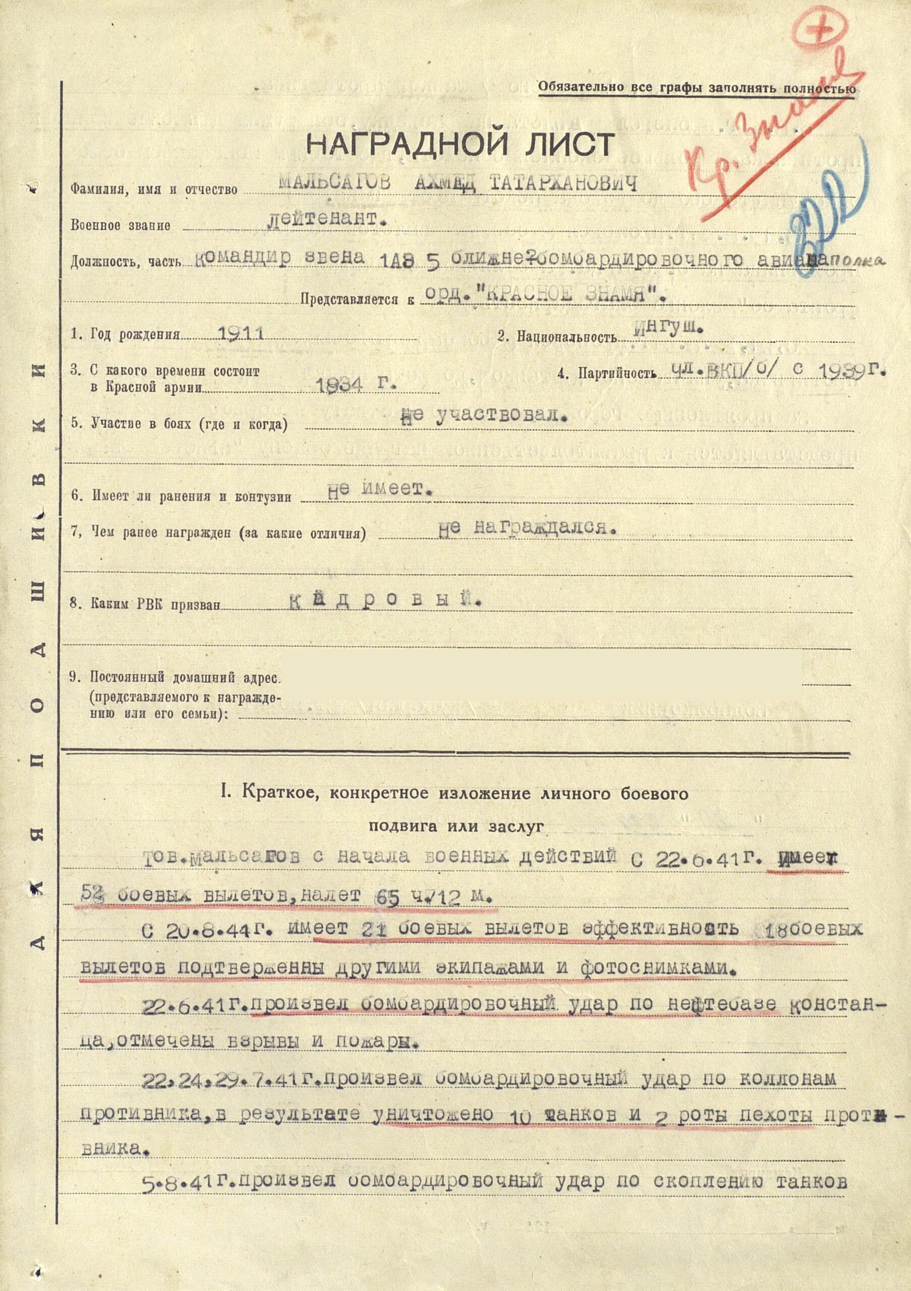 Мальсагов Ахмед родился в 1912 году в с.Альтиево, Назрановского округа Терской области. Окончил Горский кооперативный техникум, затем Сталинградскую военно-авиационную школу (1937 г.). С 1937 года служит техником-бомбардировщиком в различных авиационных частях РККА.