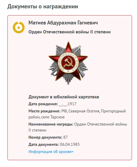 В рамках проекта «Ингушетия: Летопись Победы — сохраним память о героях»: Матиев Абдурахман Чадиевич (в официальных документах — как Гагиевич) — участник двух войн.