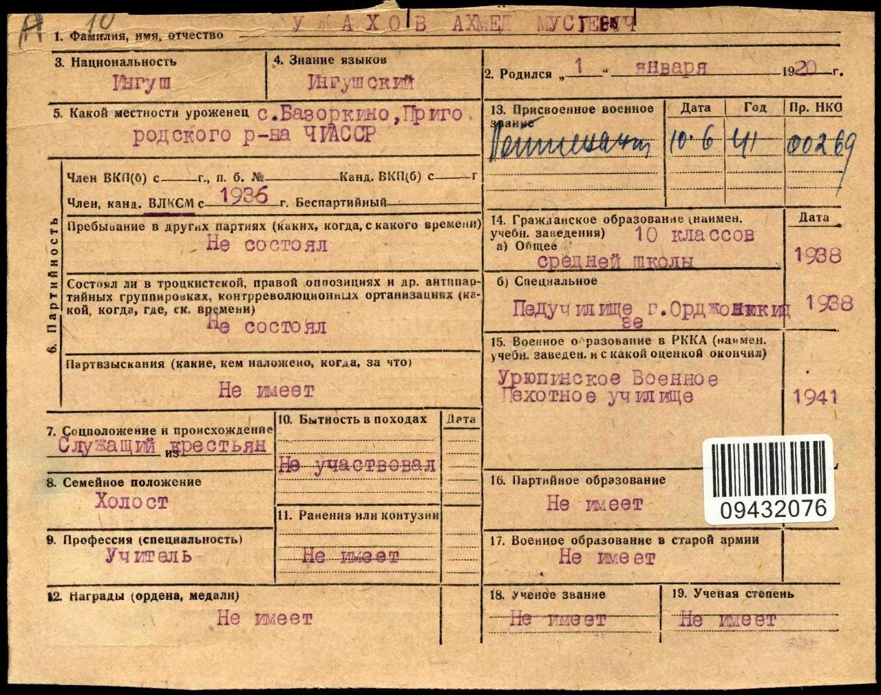 В рамках проекта «Ингушетия: Летопись Победы — сохраним память о героях»: Ужахов Ахмет Мусиевич